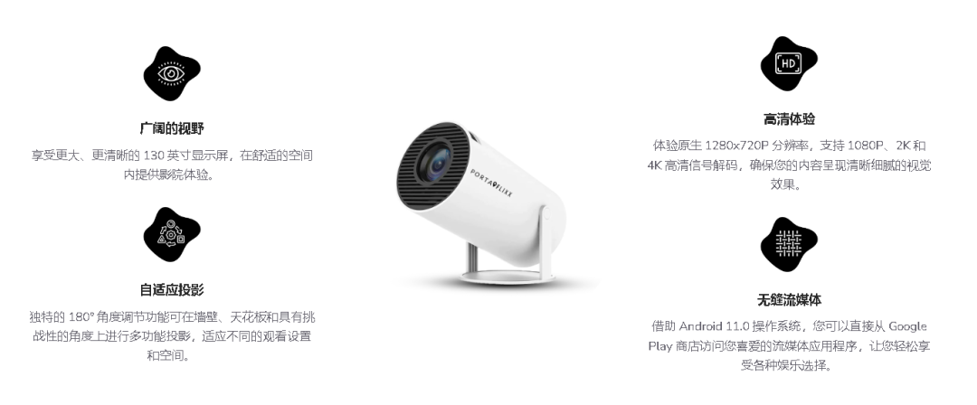 130 英寸显示屏、原生 1280x720P 分辨率、180° 的角度调节、方便携带、手动对焦和自动梯形校正功能等等,对于想要在不同场景中追求视听享受的用户来说,这款身材小巧但又功能强大的投影仪无疑是吸睛的。