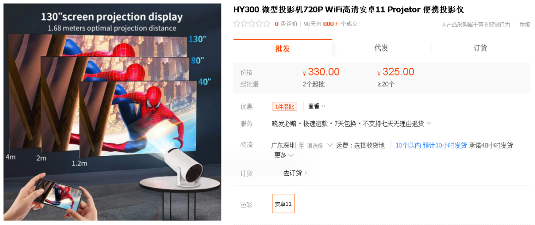 在 1688 上,这种类型的投影仪的选择也有很多。例如,前文提到的便携式投影仪就能搜到同款,价格为 330 元。
