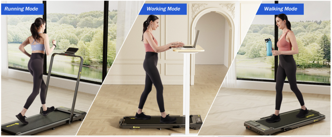 除此之外,还有工作模式:它可以被放置在升降办公桌或站立办公桌下,人们可以一边办公,一边在跑步机上走动,达到避免长时间久坐和轻度锻炼的目的。除了功能创新之外,它比传统的跑步机更加轻便,占地面积小,容易收纳。在不使用的时候可以折叠起来放入沙发底下或靠墙放置,能够适配小户型房子。