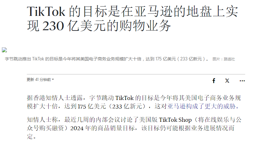 近日,有消息称:伴随着 2024 年的到来,美国版 TikTok 要将其电子商务业务规模扩大十倍,达到 175 亿美元。这似乎进一步彰显了 TikTok 对掘金美国电商市场的野心。对于新的商品销量目标,不少业内人士认为这也是 TikTok 开始积极寻求扩大在美业务的显性信号。