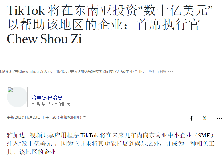 TikTok 重金布局东南亚,图源:straitstimes