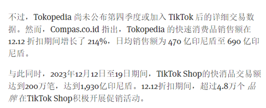 如今看来,这似乎是一个明智的决定。近日,compas 调查了合作后 TikTok Shop 与 Tokopedia 这两大电商平台的销售变化情况。Compas 提到:“虽然目前 Tokopedia 并未公布 2023 年第四季度或在加入 TikTok 后的详细销售数据,但去年双 12 期间,Tokopedia 平台的快速消费品销售额实现了爆发式增长。”