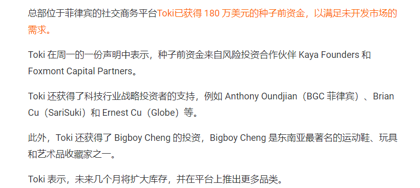 近日,据媒体报道,菲律宾社交电商平台 Toki 获得了 180 万美元种子轮融资。该平台表示,将用这笔投资继续扩大库存、推出更多品类的商品。