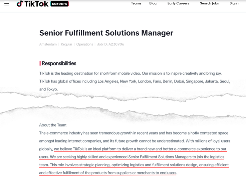 不过即便存在一定的困难与挑战,TikTok 也从未停下过掘金欧洲电商市场的脚步。2023 年 12 月,TikTok 宣布为更好地保护欧洲用户的隐私,未来 10 年将在欧洲投资超 120 亿欧元,用于实施“三叶草项目”;无独有偶,同样是在 2023 年 12 月,不少人发现 TikTok 开始在欧盟国家地区疯狂招聘与电商、物流相关的职位,欲加快在欧洲拓展电商业务的步伐。