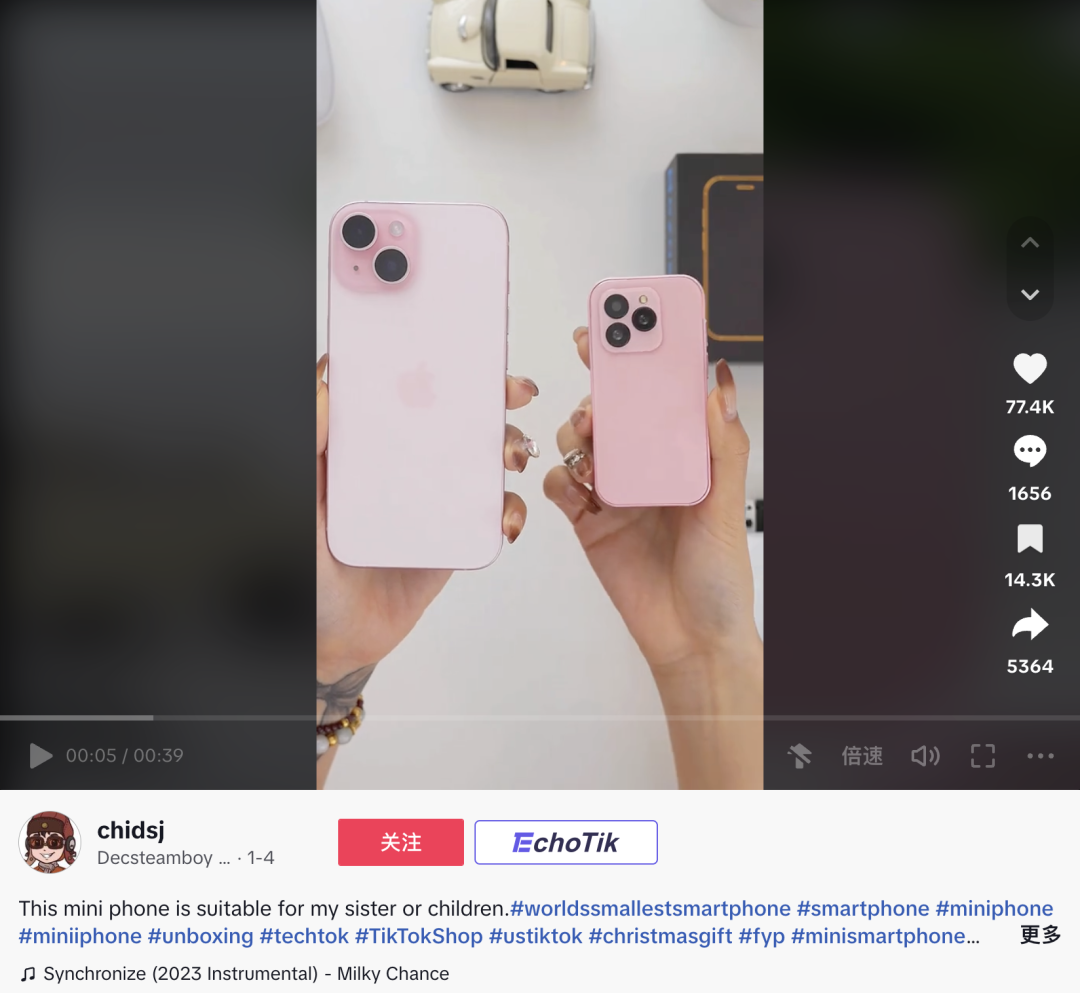 带货账号 @decsteamboy us 发布的带货视频通过使用常规 iPhone 手机来对比,进行外观展示,突出强调了智能手机的袖珍尺寸。在这不到 40 秒的视频中,他展示了迷你手机的多种功能,包括:日常接打电话、网上聊天、看视频、拍照,甚至是玩游戏也不会卡顿,突出强调了这款迷你智能手机「麻雀虽小,五脏俱全」的卖点。这条视频最终得到了 360 万曝光,和近 5.2 万美元的预估 GMV 转化。