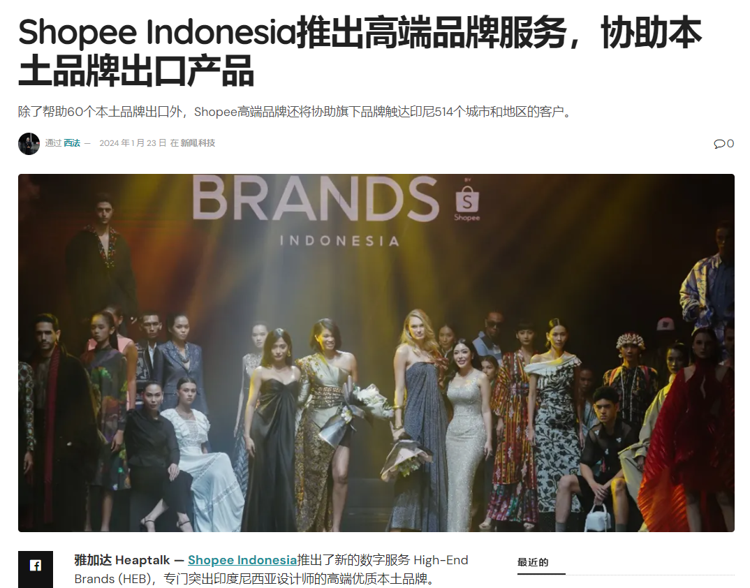 近日,据媒体报道,东南亚电商巨头 Shopee 在印尼推出了一个名为“High-End Brands (HEB)”的销售平台,专门招揽印尼本土的高端时装品牌入驻,帮助这些本土品牌型卖家和设计师进行销售,之后进一步打开海外市场。