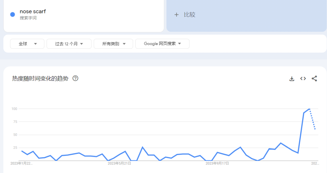 而在谷歌趋势上,“nose scarf”在近一星期以来的搜索热度上升明显,其搜索频率最高的区域主要来自英国、挪威、加拿大、瑞士以及美国。