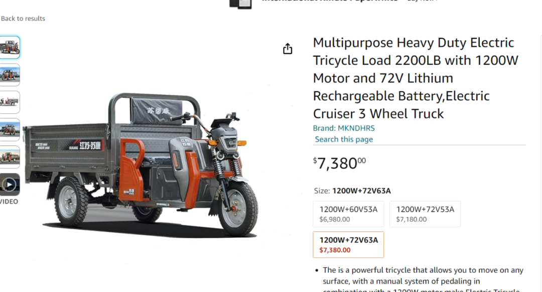 雨果跨境搜索亚马逊平台,发现其他的品牌商家也开始上架了三轮车。其中一个链接,售价七千多美金,也是近期才上传的产品。雨果跨境搜索该品牌,发现也是国内知名的三轮车品牌,趁着如今三轮车海外正火,加紧入局。