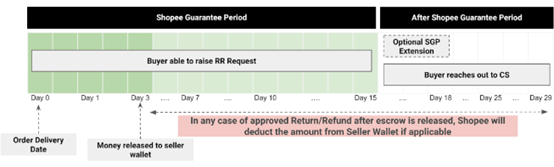 比如,就在不久前,Shopee 马来西亚站正式宣布将于 2024 年 3 月 19 日起更新退货/退款政策。按新政策的规定,所有卖家的 SGP(Shopee 保证期)都将调整为订单交付后 15 天,而不管消费者是否会在 15 天提交退货或退款申请,资金都将在订单交付后 3 天内释放到卖家钱包之中。