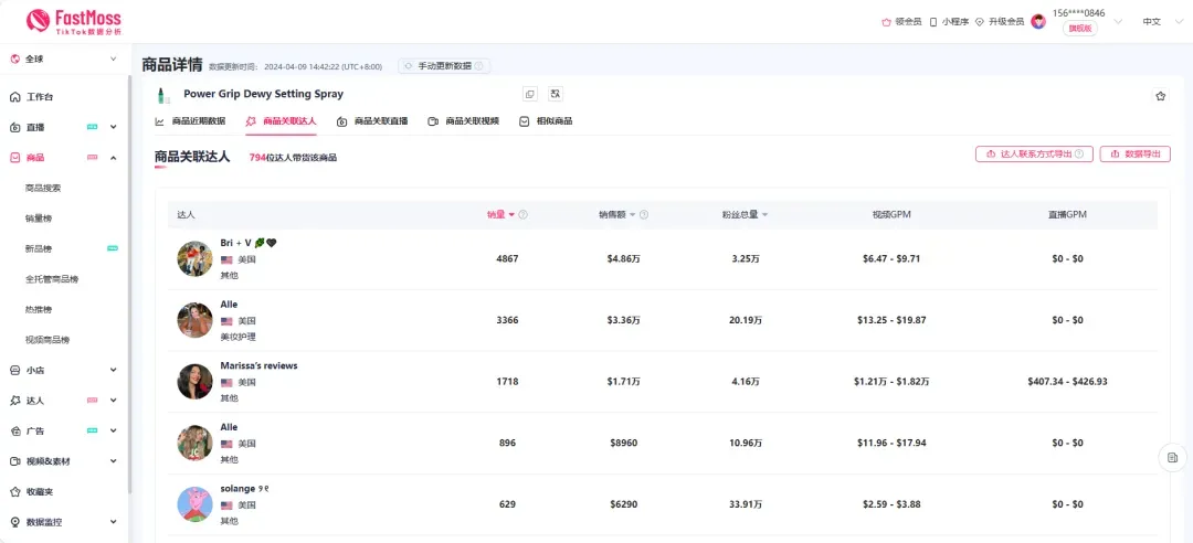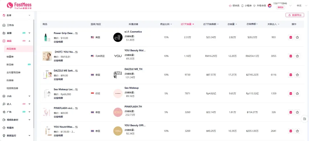 据 FastMoss 数据显示,近七日内,定妆喷雾在 TikTok 小店全球市场中的表现尤为抢眼。多个知名品牌如 Y.O.U、DAZZLE ME 以及 Sea Makeup 的定妆喷雾均呈现出热销态势。