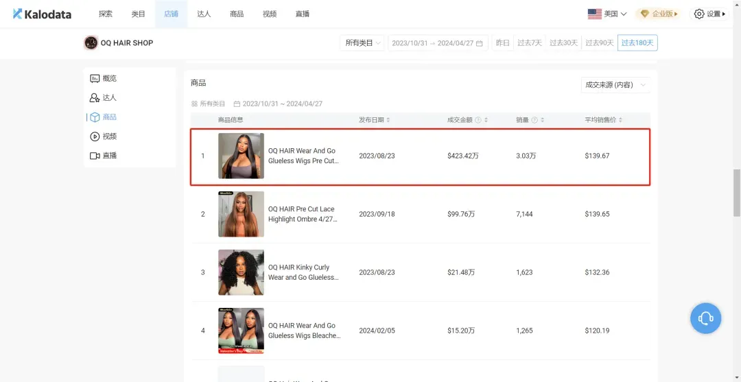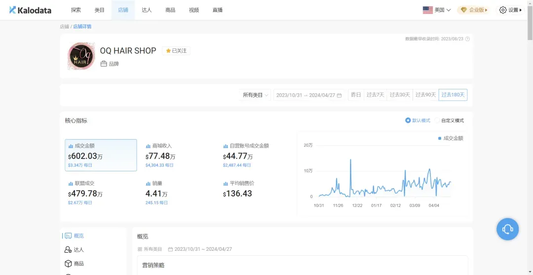 据 Kalodata 数据显示,OQ Hair 在 TikTok 美国小店表现抢眼,过去半年销售额超过 600 万美元,销量达 4.41 万件,其中 80% 的销售额来自于联盟达人。