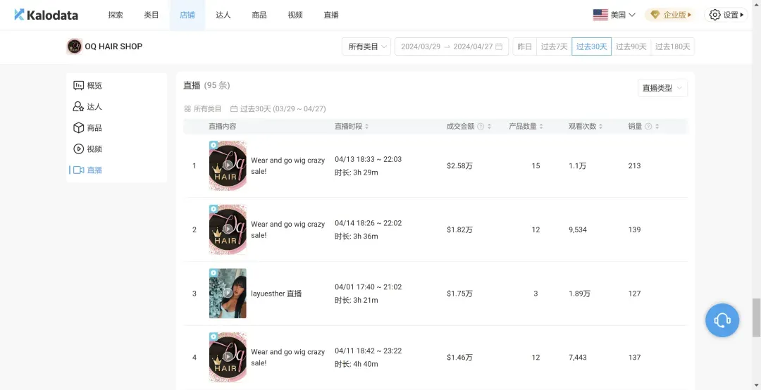 此外,OQ Hair 还在尝试直播带货模式,虽然目前仍处于摸索阶段。最近一个月,OQ Hair 的账号共直播了 95 场,最高一场直播带来了 2.58 万美元的销售额。除此之外,它还与多位达人合作进行带货直播。