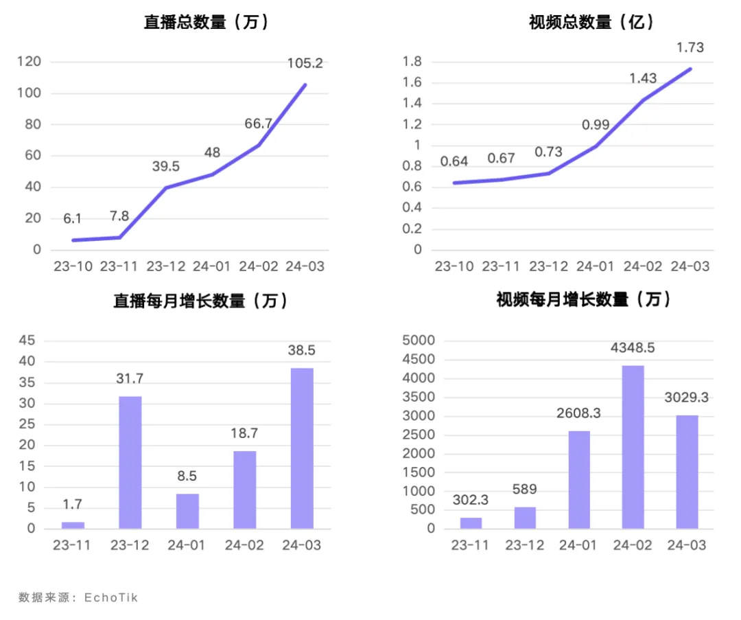 此外,直播带货作为辅助购物方式,正在受到更多本地消费者的认可。在 24 年 3 月直播数量增长 38.5 万次,总计超过 105 万次,较去年 10 月增长超过 17 倍。