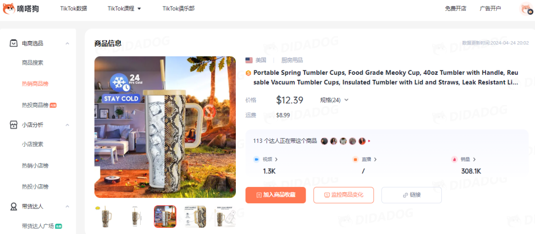 根据嘀嗒狗数据显示,这款产品在 8 月 23 日上架 TikTok Shop,3 月一整个月的日均出单量都在 1000 单左右,商品总销量超 30 万单,销售额近 400 万美金。成为主营水杯用具小店 MeokyShop 的冠军产品,并且以它为原型,根据不同使用场景、使用季节,生产出了更多款式各异的产品。