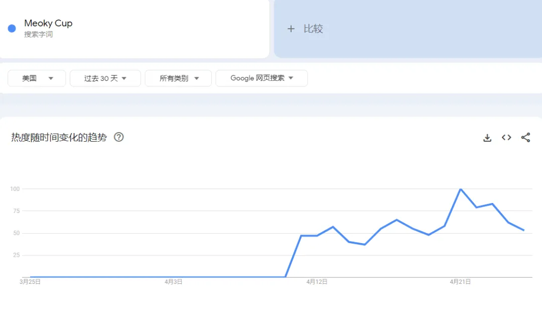 通过 Google Trends 我们可以了解到一定时期内,产品关键词在搜索引擎上的搜索热度和市场趋势。从下方搜索趋势不难看出美国地区关于“Meoky Cup”的搜索热度自 4.11 日起,开始逐步上升,说明炎热天气下,人们对水杯的需求也开始有所增大。
