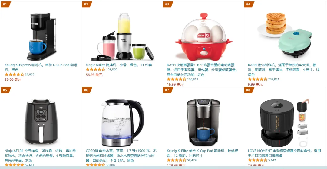 亚马逊美国站和 eBay 平台上,小型厨房电器如咖啡机、搅拌机、蒸蛋机、空气炸锅是持续热卖的小家电产品;家居清洁品类中吸尘器、空气净化器、加湿器、扫地机等也长期霸占品类头部,拥有可观的销量。