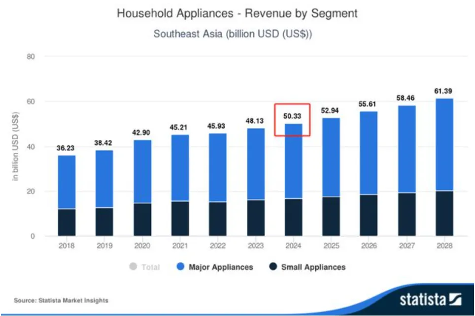 根据 Statista 预测,在东南亚地区,家电市场正展现出强劲的发展潜力,2024 年该区域家电市场收入将达到 503.3 亿美元,其中,大家电市场收入为 334.5 亿美元,小家电市场收入预计将达到 168.8 亿美元。2023 年小家电市场营收将达到 1,134 亿人民币。