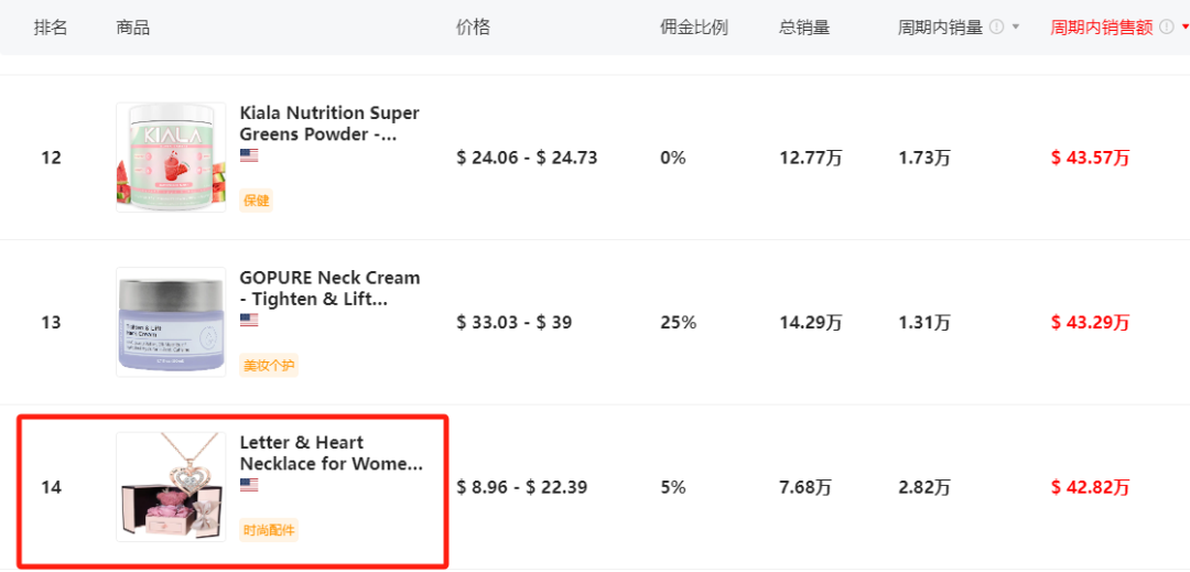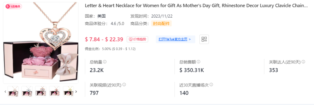在 TikTok 美区小店中,这款售价 7.89-22.39 美金的“女士配饰玫瑰礼盒”的母亲节商品也成为“时尚配饰”类目的爆款,并排在本周总商品榜的第十四位。