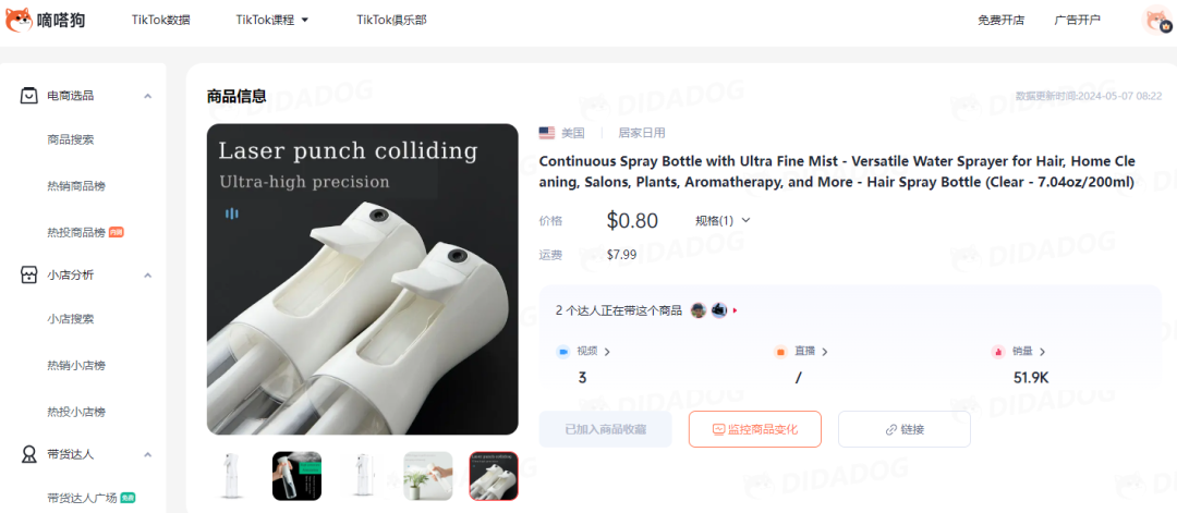 嘀嗒狗数据检测到最近有一款十分便宜又好用的喷壶销量暴增,单日出货达万单,是本月新上架产品中不容小觑的一匹黑马。