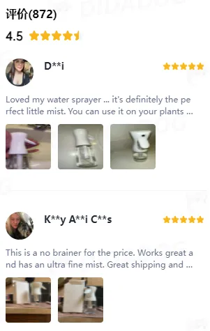 通过嘀嗒狗数据可以看到已购用户的评论,商品拥有 872 条评价,获得 4.5 的评分。所有使用者都表示这款喷壶是他使用过最好用的一款,它所产生的出来的水雾是“完美的”。