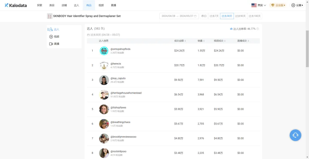 SKNBODY 品牌在 TikTok 上的营销同样值得关注。过去 30 天共有 382 位达人参与推广,达人出单率达 46.77%(所选时间范围内,带过该商品且至少卖出过 1 件的达人数量/带过该商品的达人数量),从成交金额 Top10 的达人来看,主要还是通过中腰部达人出单为主。