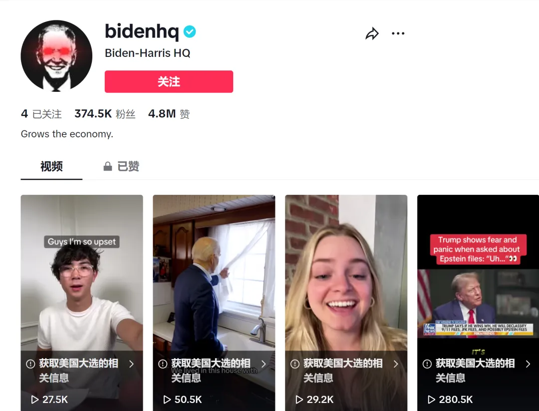 与拜登相比,特朗普在 TikTok 上的受欢迎程度已然占据了些许优势。截至目前,拜登的 TikTok 平台账号仅有 37.45 万粉丝,该账号发布了 224 条视频也仅获得 480 万点赞。通过两人在 TikTok 账号上的数据显示来看,特朗普似乎更受欢迎。