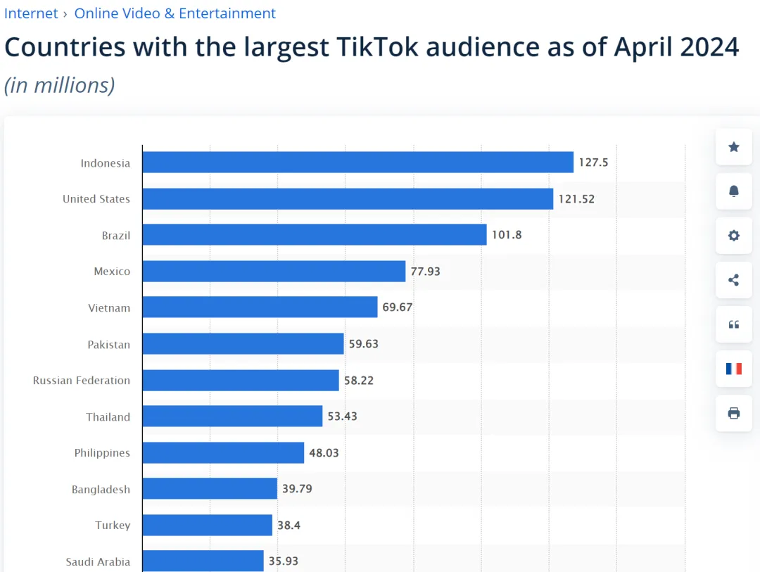 截至 2024 年 4 月, 根据 Statista 数据显示,有 1.21 亿美国人使用 TikTok,几乎是美国总人口的一半。