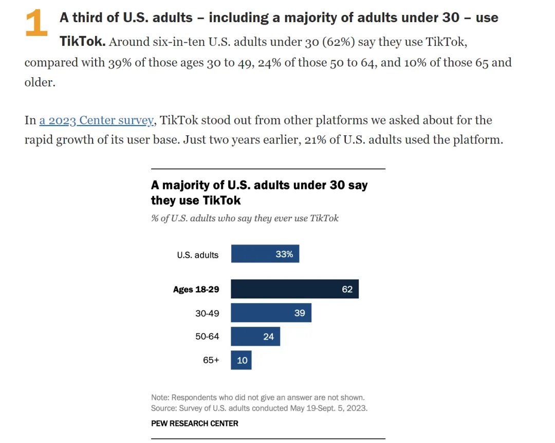 根据 Pew Research Center 发布的调查结果显示:18~29 岁的美国年轻人中,使用 TikTok 人数占比 62%。调查结果表明,TikTok 使用者中青年用户居多。