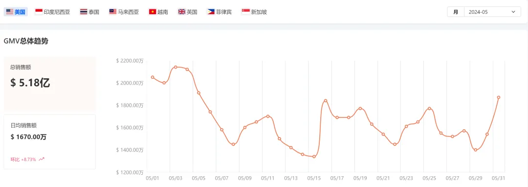 根据 Tabcut 数据,2024 年 5 月 TikTok 美国站的总销售额达到了 5.18 亿美元,日均销售额高达 1670 万美元,环比增长了 8.73%。这充分说明了美国拥有着巨大的市场潜力。