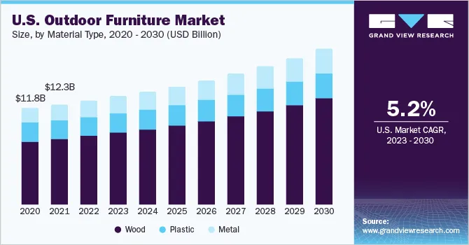 我们来看看户外家具类目的市场规模。根据 Grand View Research 的数据, 2022 年 46.20 亿美元预计从 2023 年到 2030 年将以 5.7% 的复合年增长率增长。全球产业的增长主要是由于酒店、度假村、露天空间和公共花园对户外家具产品的需求不断增加。而在美国,Statista 的数据显示,2023 年户外家具的市场规模约为 47 亿美元,并且这个数字还在持续增长。