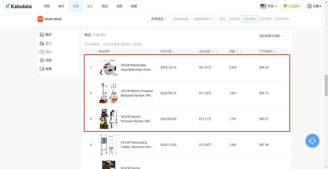 VEVOR 在 TikTok 上的成功离不开它对季节性热销爆品的预测。随着夏季的到来,家庭园艺和庭院维护成为许多美国家庭的刚需。VEVOR 准确把握这一时机,将花园用品作为主推产品,实现了销量的快速增长。在过去 30 天,店铺成交金额为 176.13 万美金,销量排名前三均为花园灌溉类产品,销量超 6000 件,占比营收 31%。