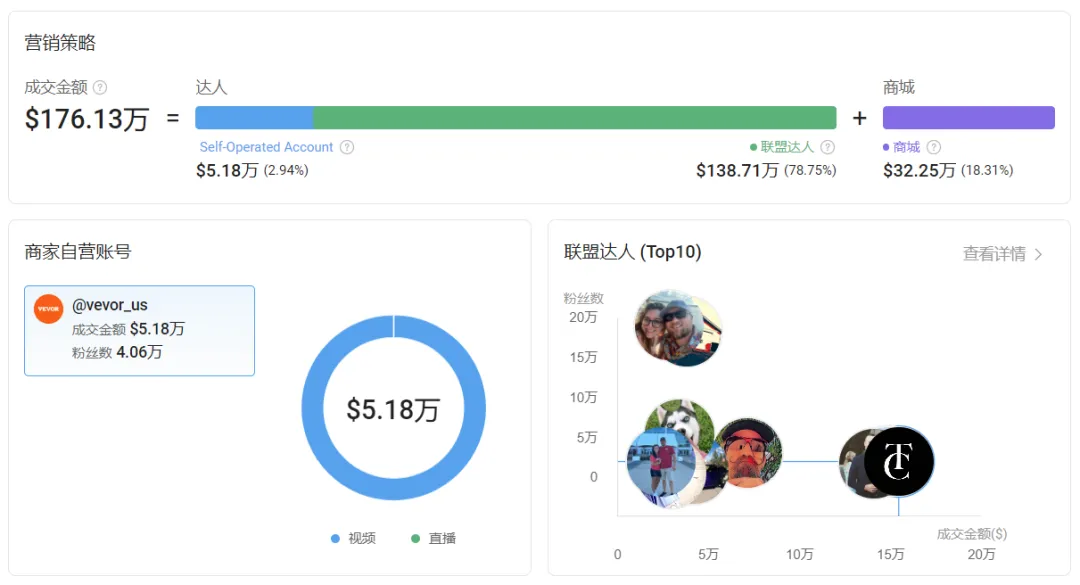 从成交金额收入构成来看,主要通过联盟达人带货,过去 30 天成交金额为 138.71 万美金,占比 78.75%。带货金额 Top10 的达人粉丝数在 1-20 万之间,他们的内容更加真实可信,能够有效影响粉丝的购买决策。
