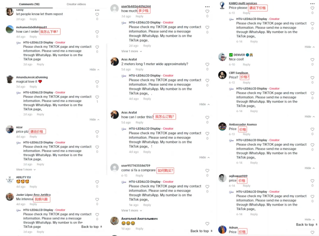 在播放量持续升高的同时,这家 LED 显示屏工厂前来询盘的人数也越来越多,许多客户都在他们视频的评论区留言,询问显示屏的价格是多少?要怎么订购?远的不提,单从下图中近期的留言内容来看,便可以看到这家 LED 显示屏工厂的生意有多红火,可谓前来询盘的人不断。