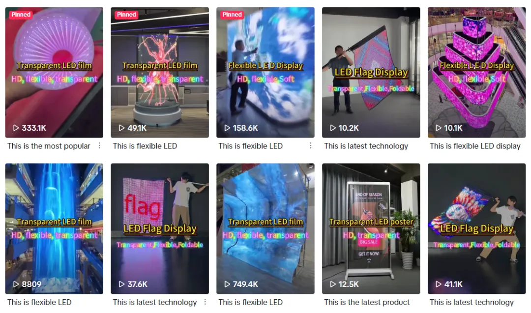在 LED 显示领域,产品包括 LED 透明屏、户外透明屏、LED 贴膜屏、透明广告机等;在 Eposter 电子海报屏系列中,产品有透明海报屏、灯杆屏、魔方屏、LED 广告机等。而为了打开海外市场,TikTok 变成了其主要的营销阵地。