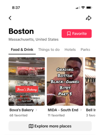 用户现在可以发现,特定地点如波士顿、纽约和德克萨斯州的页面已得到更新。除了展示相关地点的视频,TikTok 还推出了“食品&饮料”、“酒店”和“购物”等类别,汇集了相关的视频内容。