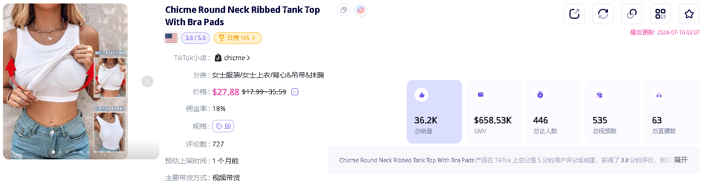 2024 年 1 月 21 日,ChicMe 趁热打铁在美国市场开通了另一家 TikTok 小店 ChicMe ,并在 5 月 31 日,赶在夏季真正到来前,再次上新了带有内置胸垫的圆领螺纹背心升级款,价格也有所上调。产品上架一个多月以来,当前总销量额已经突破了 60 万美金,成为了该店铺的明星单品,并在 TikTok 美区女装类目占据了一席之地,到目前为止,该款产品在美国市场的销量仍呈现持续增长的态势,且一直在女装类目中排名前列。