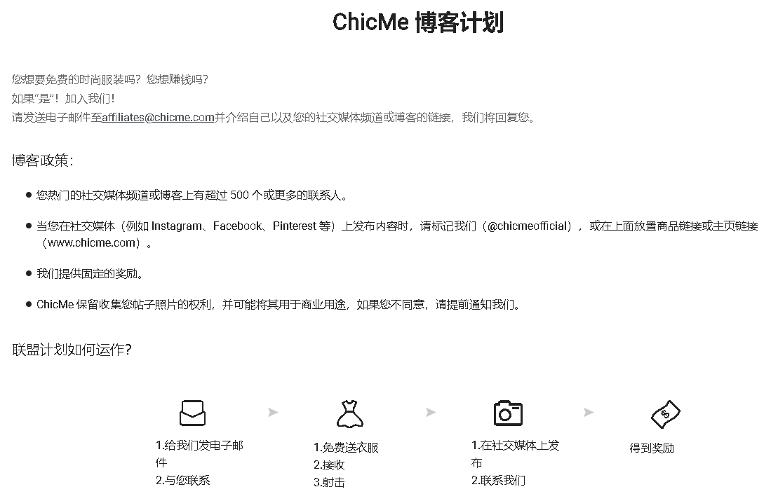 不限于主动寻求与达人的合作, ChicMe 还开发了一项“ ChicMe 博客计划”,只要满足粉丝数在 500 以上条件的中小型网红就可以发送电子邮件至官方, ChicMe 将免费赠送样衣,只需要在社交媒体平台上发布内容并@官方,或是在上面放置商品链接或主页链接,即可领取 ChicMe 提供的奖励。通过博客计划,ChicMe 希望能够为用户提供更多有价值的内容和信息,进一步增强与用户的互动和连接,提升用户的品牌认知和忠诚度。