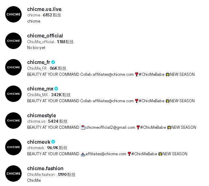 与此同时,ChicMe 还在 TikTok 上针对美国、墨西哥、法国、英国等多个市场搭建了与之相对应的矩阵账号,以此来更好了解和满足不同地区用户的需求,提升品牌在当地的影响力和美誉度。其中,官方账号 @ChicMe_official 的粉丝数量最高,达到了 110 万,英国和法国市场的 TikTok 账号也有上万的粉丝体量,虽然美国地区的账号目前粉丝数还比较少,但在 TikTok 上 ChicMe 的声量也不低。