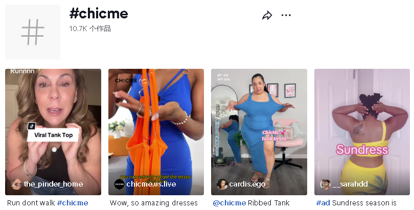 截止目前,标签# ChicMe 在 TikTok 上已经积累了超 1 万个视频作品,除部分 UGC 内容以外,大多是与达人合作产出的真实的产品种草视频,ChicMe 在 TikTok 上的传播也进一步提升品牌在海外市场的声量。
