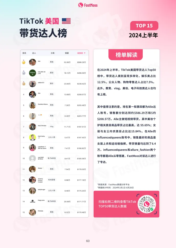 2024 年 7 月 3 日,第三方平台 FastMoss 研究院正式发布了行业报告《2024上半年TikTok生态发展白皮书》(以下简称“白皮书”)。白皮书自发布以来,在行业内迅速传播,百家权威行业媒体报道转载,激发了广泛社群互动和朋友圈关注讨论。其中,FastMoss 研究院邀请到了 TikTok 美区上半年视频带货达人榜第一的 Alle,深入探讨了 Alle 的差异化举措和她视频带货长期领先的独家心得。