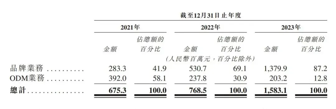 而从收入结构来看,卡罗特的品牌转型非常成功,报告期内,其自有品牌业务实现对 ODM 业务的大幅超车,占总营收的比例从 2021 年的 41.9% 增长至 2023 年的 87.2%。