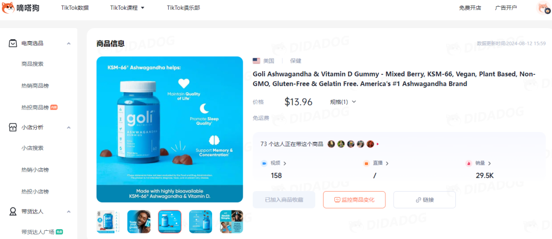通过卖家精灵可以看到,这款产品拥有 73% 的毛利率,在 Ashwagandha 类目中排名第一,整体销售趋势正在大幅度上升之中。