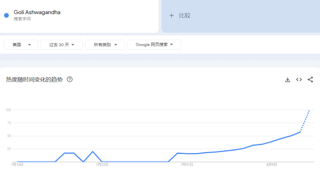 通过 Google Trends 我们可以了解到一定时期内,产品关键词在搜索引擎上的搜索热度和市场趋势。输入关键词“Goli Ashwagandha”可以看到,近 30 天内,美国地区关于这款产品的搜索趋势和销售趋势重合度非常高,可以看出这款产品在 TikTok 获得曝光后,瞬间吸引大批消费者搜索本款产品。