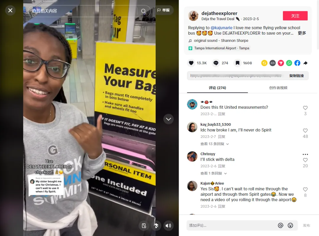 用户 @dejatheexplorer 发布这条仅 8 秒的视频获得了超过 430 万次播放量,引发了用户对行李箱品牌的热议和购买热潮。这类现象表明,用户分享体验和实用性内容能极大地推动产品的市场认知和销售增长。