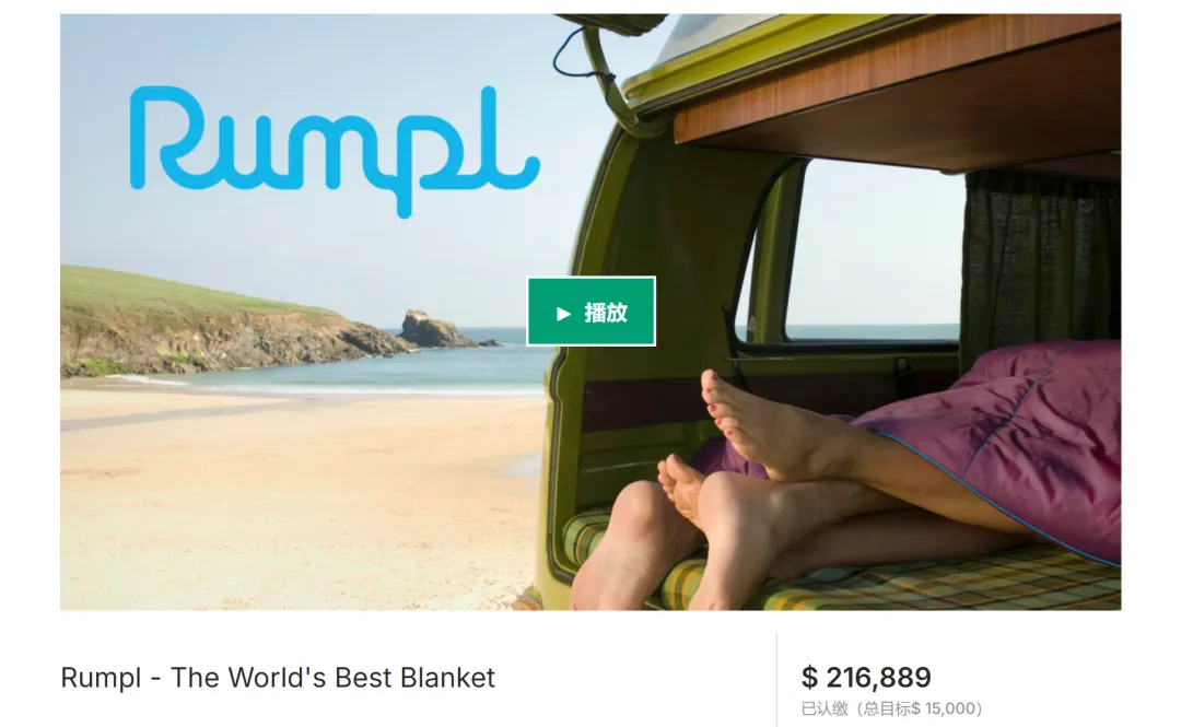 为了验证市场对产品的接受度,创始团队决定通过众筹进行低成本试错。2014 年,Rumpl 在众筹平台 Kickstarter 上发布了首款产品,号称“受积极生活方式启发,采用专为户外行业开发的材料制成”,不仅柔软、耐用,而且防水、防污、防臭,用途广泛。