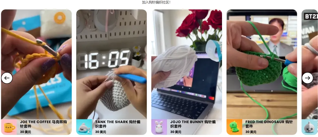 值得一提的是,在独立站上,The Woobles 还设置了钩针编织社区,来自世界各地的钩针爱好者们将自己的钩针作品拍成视频上传分享。该举措不仅与用户保持紧密互动,还让用户增强了参与感与成就感,进一步加深对品牌的忠诚度。