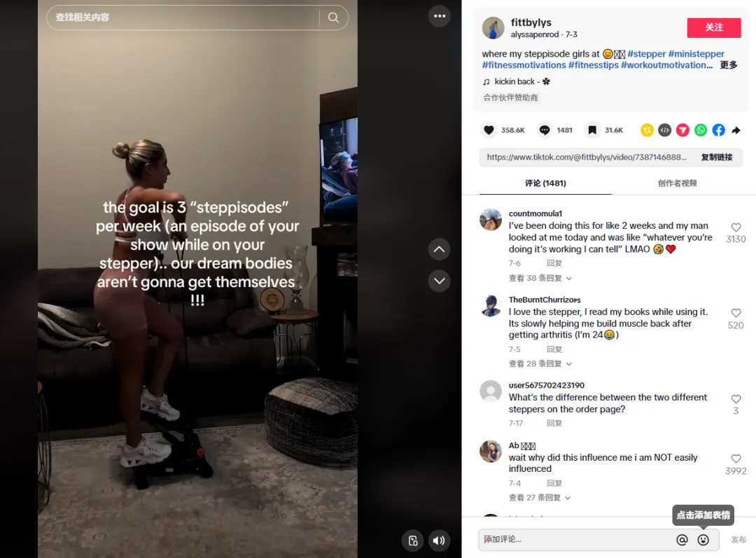 他们在 TikTok 上设立了话题标签 #Fitnessathome,并鼓励用户分享自己使用 Niceday Steppers 进行锻炼的视频,通过参与话题挑战,用户不仅能够展示个人的健身成果,还能传播“舒适有氧运动”的生活理念。