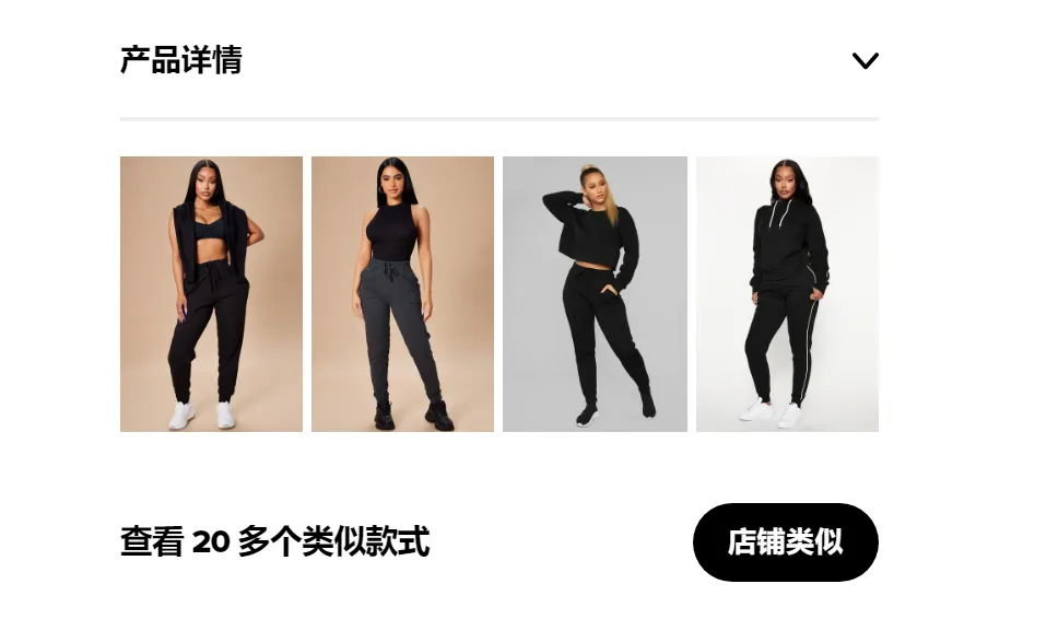 同时,为了提升转化率和客单价,Fashion Nova 还在产品详情下方开设了“店铺类似”功能,用户可以利用此功能扫描模特身上的产品,从而获得店铺类似款式的推荐。