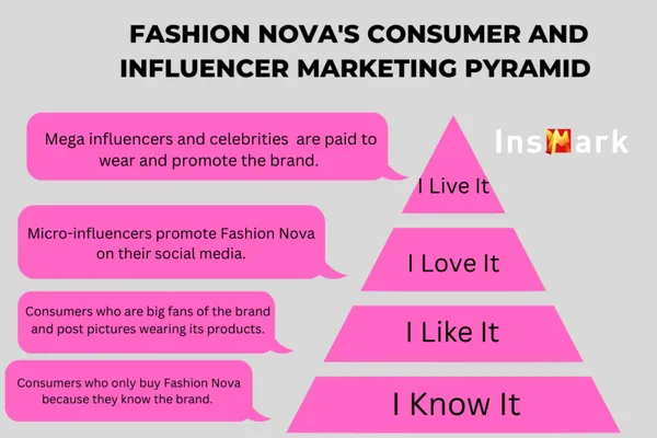 为了实现高效的品牌推广,Fashion Nova 将合作对象和消费者分为四个级别,从最顶层的名人代言到最底层的普通消费者认知,形成了一个全面的营销网络: