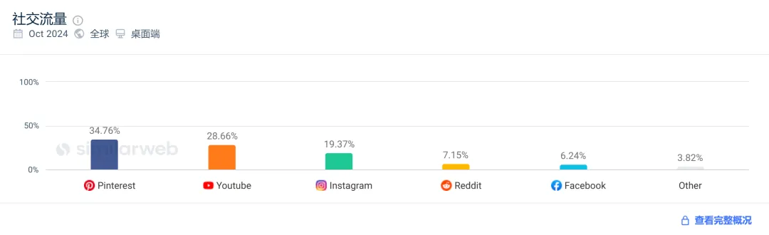 数据显示,2024 年 10 月,Fashion Nova 独立站的社媒流量中,来自 Pinterest 的占比达 34.76,Youtube 占比达 28.66%,Instagram 则为 19.37%。不难看出,在 Instagram 的增速趋于平缓后,Fashion Nova 开始寻找新的流量洼地。